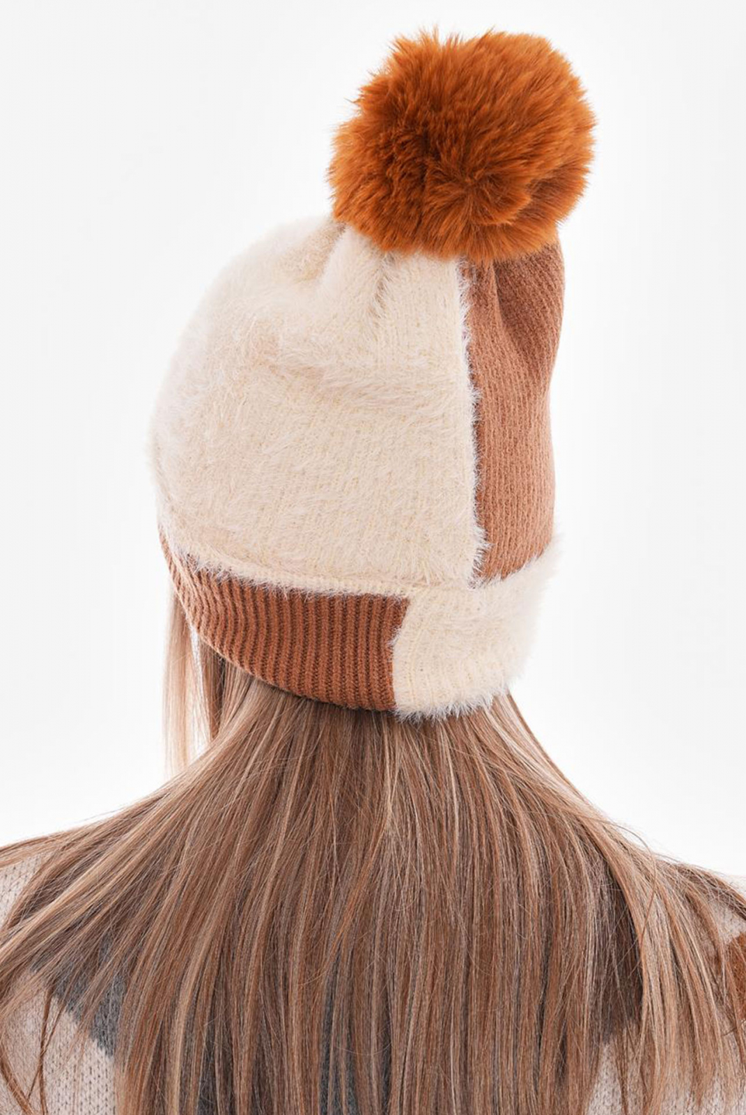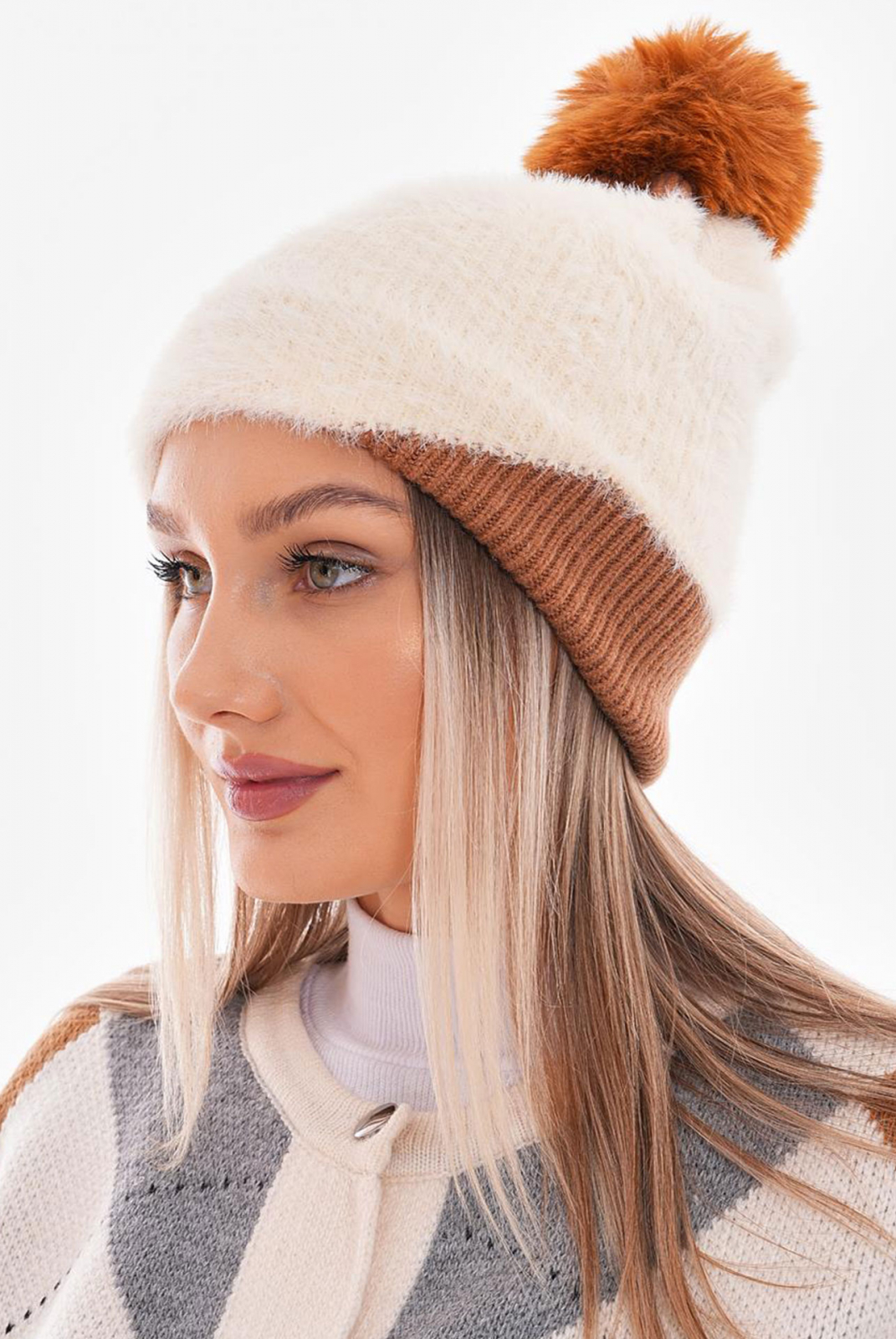 Caciula tricotata cu pompon, in doua culori si doua texturi.