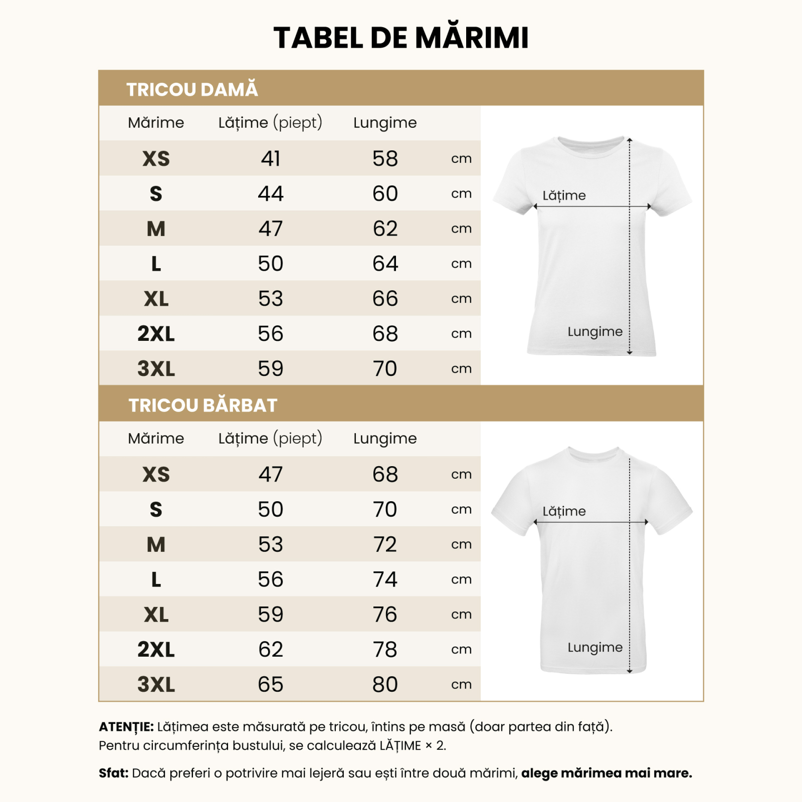 INFO: Pozele sunt cu titlu de prezentare. Tricourile au croiala clasica, conform imaginii din tabelul de marimi. Pot exista mici diferențe de nuanță între fotografia de prezentare și produs datorită prelucrării fotografiei.